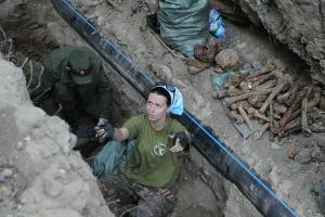 Волгоград - город, где наследие войны постоянно напоминает о себе, стоит лишь чуть углубиться в землю. Чуть ли не каждую неделю при проведении строительных работ находят неразорвавшиеся снаряды и бомбы, больше 70 лет пролежавшие в земле. Так получилось и с братской могилой. На улице Репина начали менять водопроводные трубы, и рабочие, когда раскопали траншею, на глубине около двух метров наткнулись на кости. О находке сразу же сообщили поисковикам.