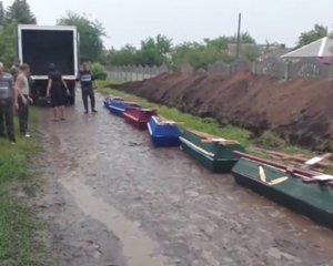 В сети появилось видео, на котором заснята часть похоронной процессии в Славянске. Убитых ополченцев закапывают прямо у дороги возле забора в одну сплошную могилу, больше похожую на окоп или канаву. Ополченцев отпевает священник. Хоронят ополченцев в гробах и для каждого из них приготовлен крест, на некоторых даже можно разглядеть имена убитых. Примечательно, что прямо через дорогу от того места, где вырыты могилы для ополченцев, находится кладбище.