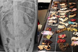 Врачи ветеринарной клиники DoveLewis Emergency Animal Hospital в Портленде (штат Орегон) во время операции достали из желудка собаки 43 с половиной носка. Как сообщает The Oregon, после хирургического вмешательства животному удалось полностью восстановиться.