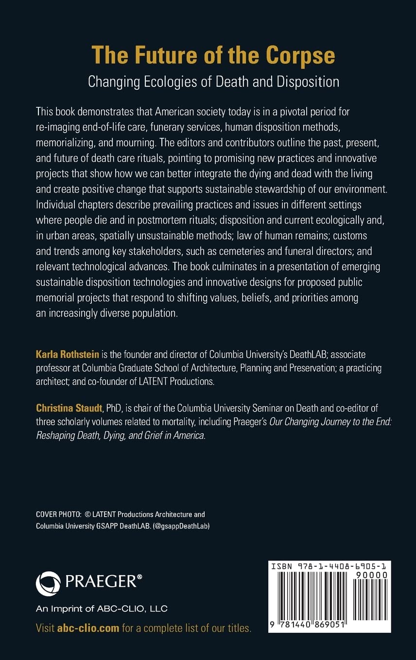 The Future of the Corpse: Changing Ecologies of Death and Disposition под редакцией архитектора и профессора GSAPP Карлы Ротштейн, основателя и директора GSAPP DeathLAB, и Кристины Штаудт, сопредседателя семинара Колумбийского университета по смерти, рассматривает спектр смерти.