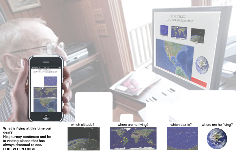 PRAY THE DEAD The virtual application is a program that allows you to view the position of the object using the gps, its altitude, its position on the star maps and the journey took place, relatives of the deceased can follow the steps and interact with their loved one through your computer, tablet or phone.