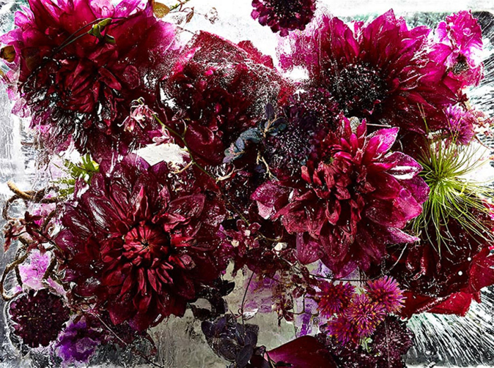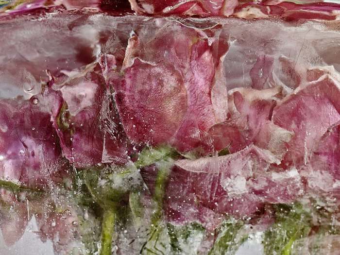 Чтобы сделать серию фотографий, она замораживает цветы в больших ледяных блоках. Яркие лепестки, замершие подо льдом, выглядят как акварельные разводы на стеклянной палитре художника.
