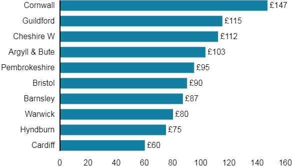 Councils with the highest price increases compared to 2019-20 (£)
