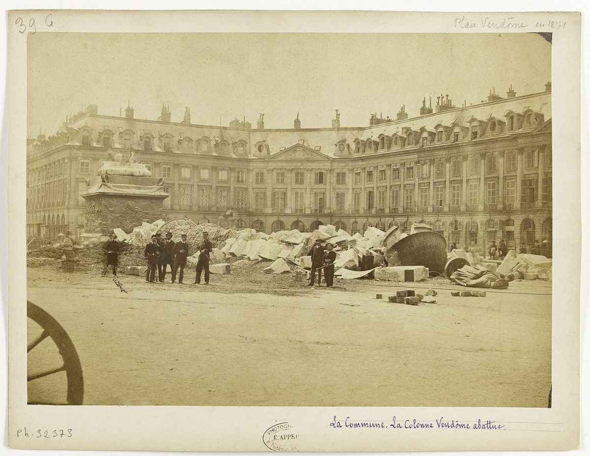 A photograph by Ernest Charles Appert shows Communards standing in front of the downed Colonne Vendôme, a monument to the First French Empire under Napoleon. This highly symbolic gesture accompanied the burning of the guillotine, marking a departure from the 18th century’s indiscriminate violence. The Commune transferred economic and military power away from wealthy elites and made positions of authority revocable for politicians, soldiers, and police officers alike. The flight of private property owners reduced violence and petty crime in the city, as Karl Marx described in The Civil War in France.