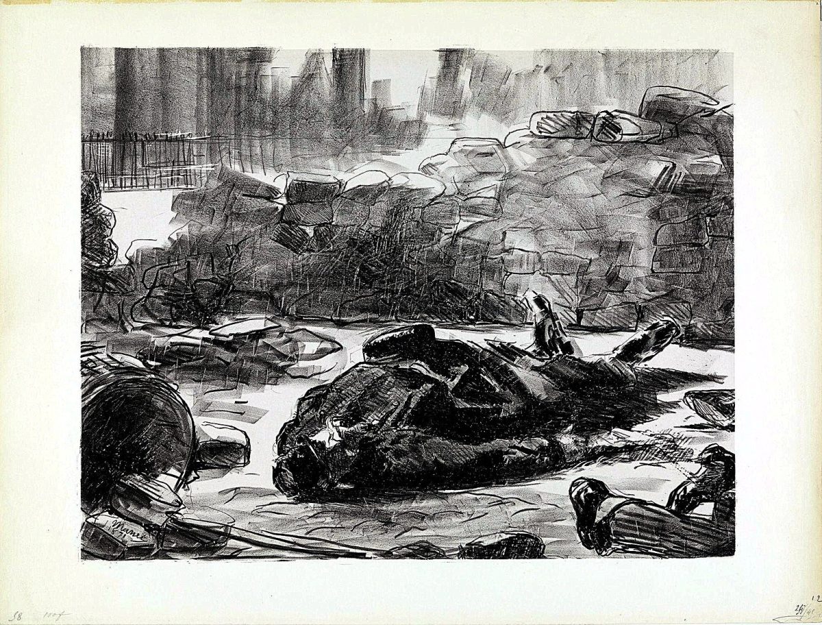 Anarchist artist Maximilien Luce painted massacred Communards in shades of deep blue. Édouard Manet, André Devambez, and Gustave Boulanger each created visceral battle scenes. Manet’s brother Gustave worked in the Ligue d’union républicaine des droits de Paris (the Republican League of the Rights of Paris), which attempted in vain to forge a peaceful resolution. Édouard, who also identified as a Republican, was not in Paris during March or April, but arrived in time to witness the Commune’s destruction and the corpses strewn about the city. Two of his lithographs from this time, The Barricade and Civil War, use sparse linework and shadowing to convey their gravity. While Manet was not a vocal supporter of the Commune, these drawings reveal his own conciliationism and sympathies with the victims.