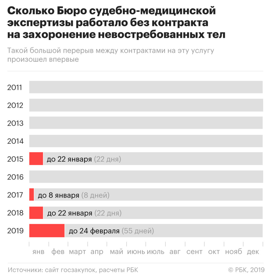 В январе и феврале 2019 года у московского Бюро судебно-медицинской экспертизы не было контрактов на захоронение невостребованных тел, следует из данных сайта госзакупок. Перерыв такой длительности в контрактах бюро возник впервые за девять лет, подсчитал РБК. В 2016 и 2018 году возникали перерывы, но существенно меньшего срока — по 22 дня в начале года.