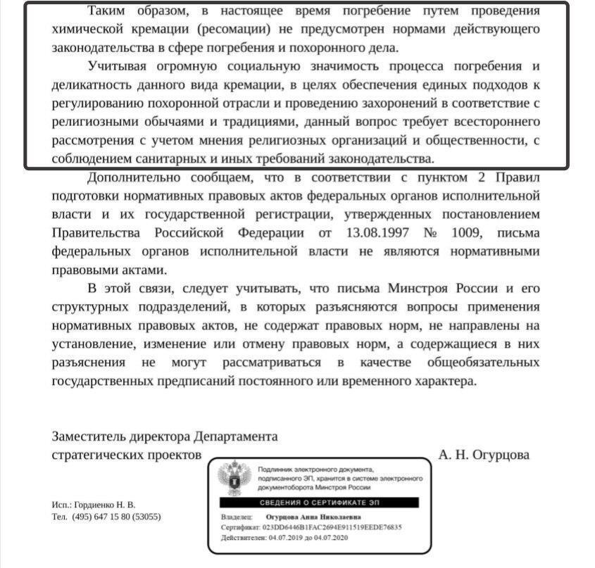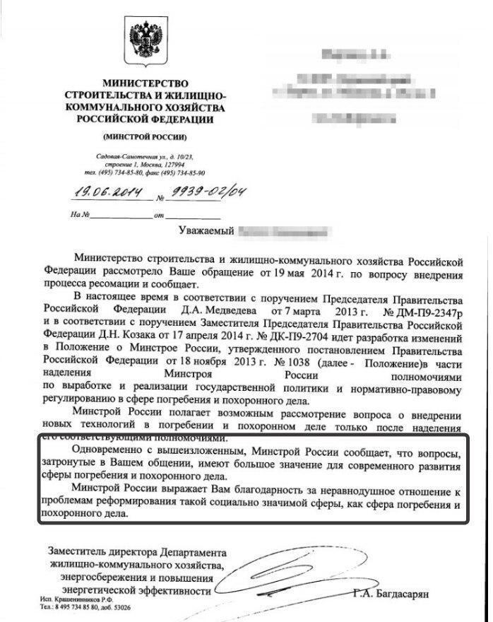 В своем письме к ведомству (есть в распоряжении редакции. — Прим. «Секрета») Солодянкин ссылался на пункт 7 («Внедрение современных технологий в сфере похоронного дела») ст. 4 проекта закона «О похоронном деле в РФ». Документ правительство разработало ещё пять лет назад, но законопроект постоянно отправляют на доработку.