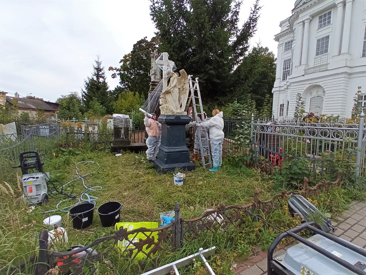 18 сентября на Всехсвятском кладбище началось восстановление мраморных ангелов. Работу проводят приглашенные специалисты «Волонтерского реставрационного центра в Санкт-Петербурге». Реставрируются надгробия конца 19 – начала 20 веков: ангел, плакальщицы и два аналоя с каменными книгами.
