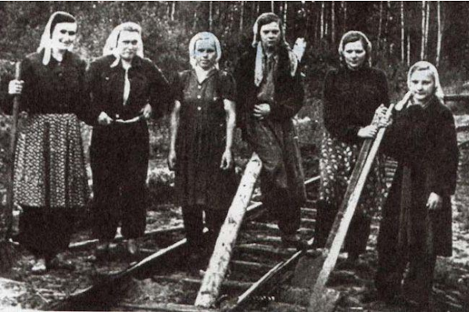 Депортированные немцы-трудармейцы спецотряда № 18-74 на строительстве узкоколейки (фото 1944 г.). Репродукция: сайт Управления госохраны объектов культурного наследия Свердловской области