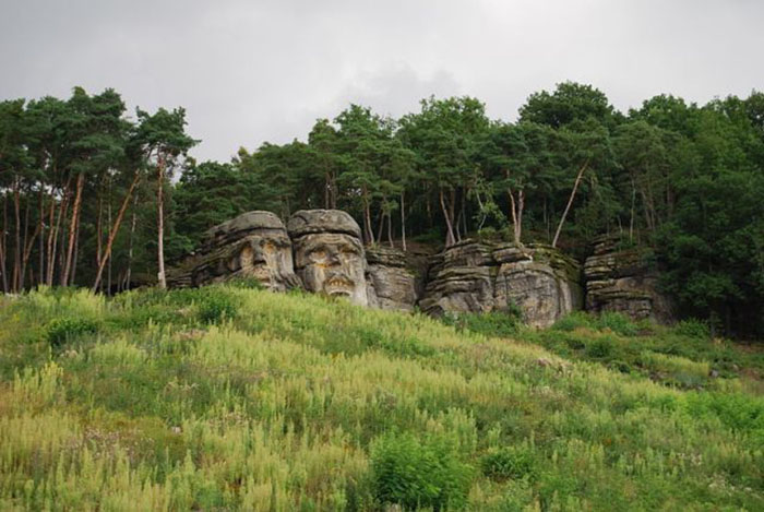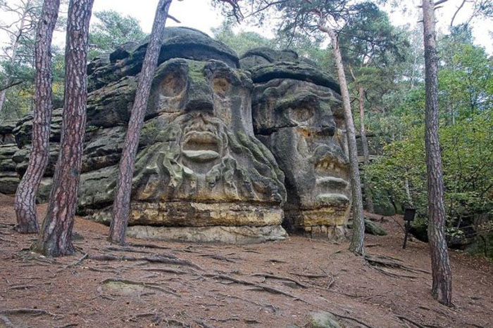 Прогуливаясь по чешской деревне Želízy, непременно набредёшь на одну из самых странных и мрачных достопримечательностей в Европе. В лесу находятся две головы мистических существ, высеченных в цельной каменной глыбе, которые охраняют лес. Они появились здесь в 1850-х годах благодаря скульптору Вацлаву Леви. Эта скульптурная композиция называется «Головы дьявола».
