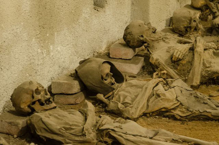 Головы скелетов расположены на кирпичных подушках. Климат внутри склепа хорошо сохранил их мумифицированные тела. Сегодня они продолжают лежать на своих местах, и посетители приходят на них посмотреть поближе.